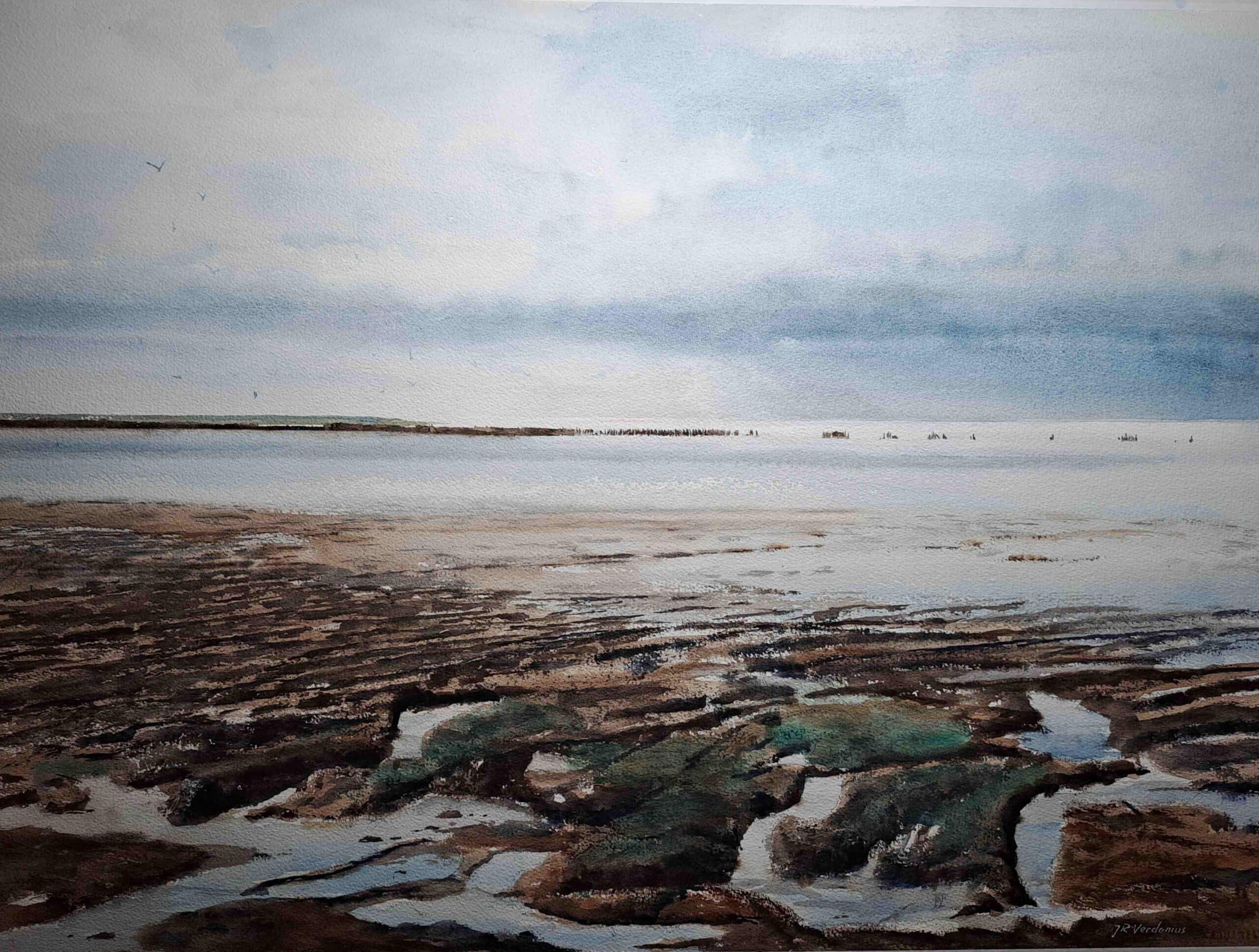De Wadden bij Moddergat bij eb, storm op komst. Naar een plein air aquarelschets
