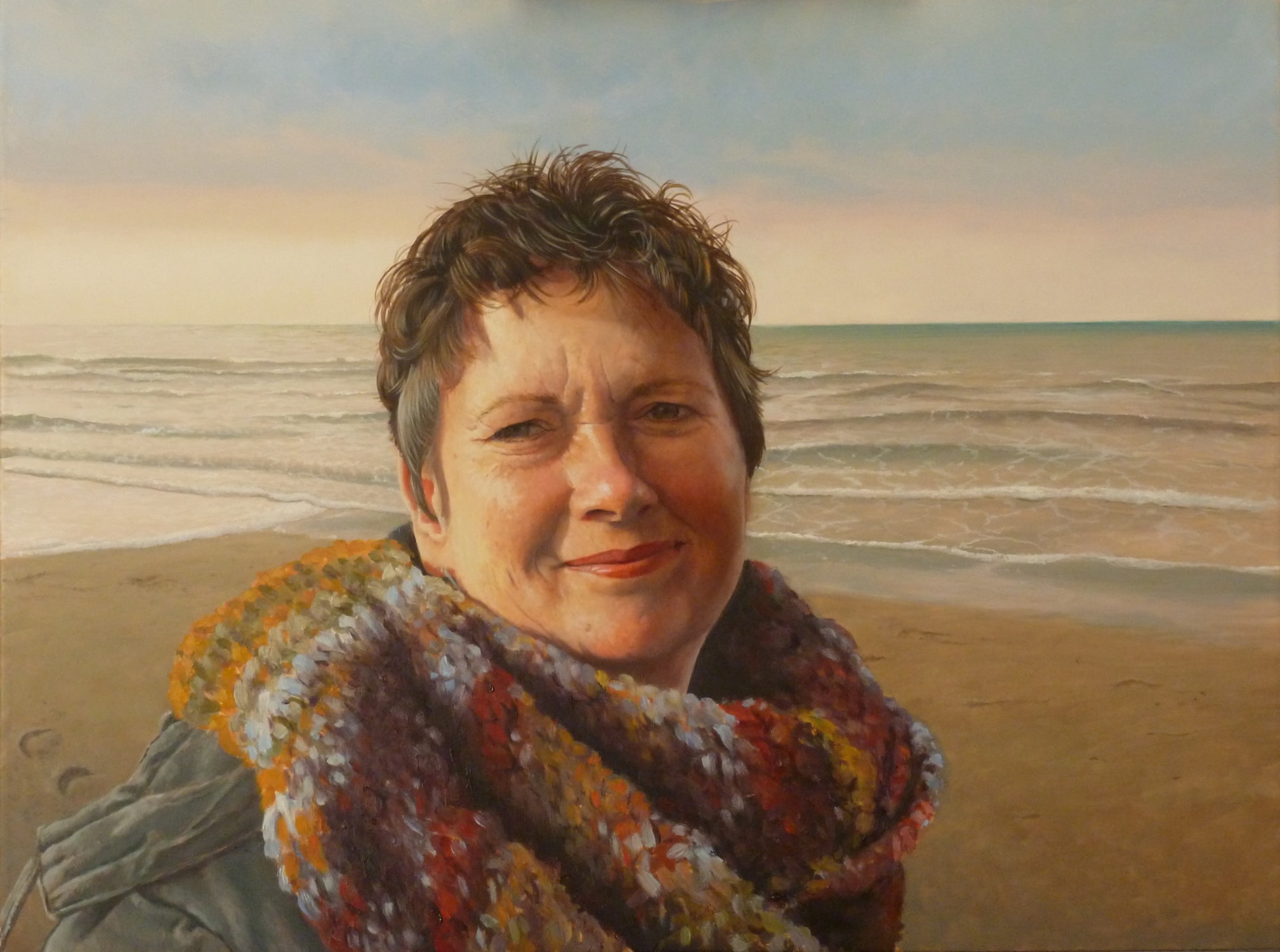 Dit is mijn nichtje Silvia die helaas een operatie niet overleefde. Voor haar echtgenoot heb ik toen dit schilderij gemaakt. De aanleiding was een fantastische foto van haar en die heb ik aangevuld met een achtergrond die haar liefde voor de kust laat zien. Dit was natuurlijk een gift.