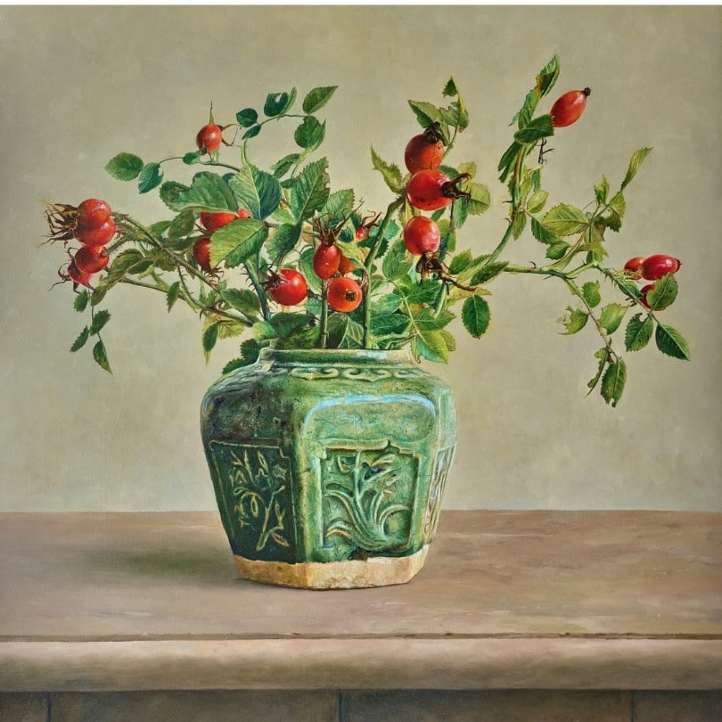 stilleven-met-gemberpot-en-rozenbottel
